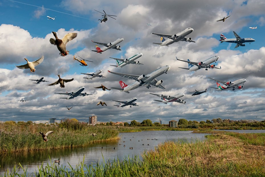 De bewerkte foto hiernaast toont 15 minuten vliegverkeer bij het vliegveld London Heathrow.