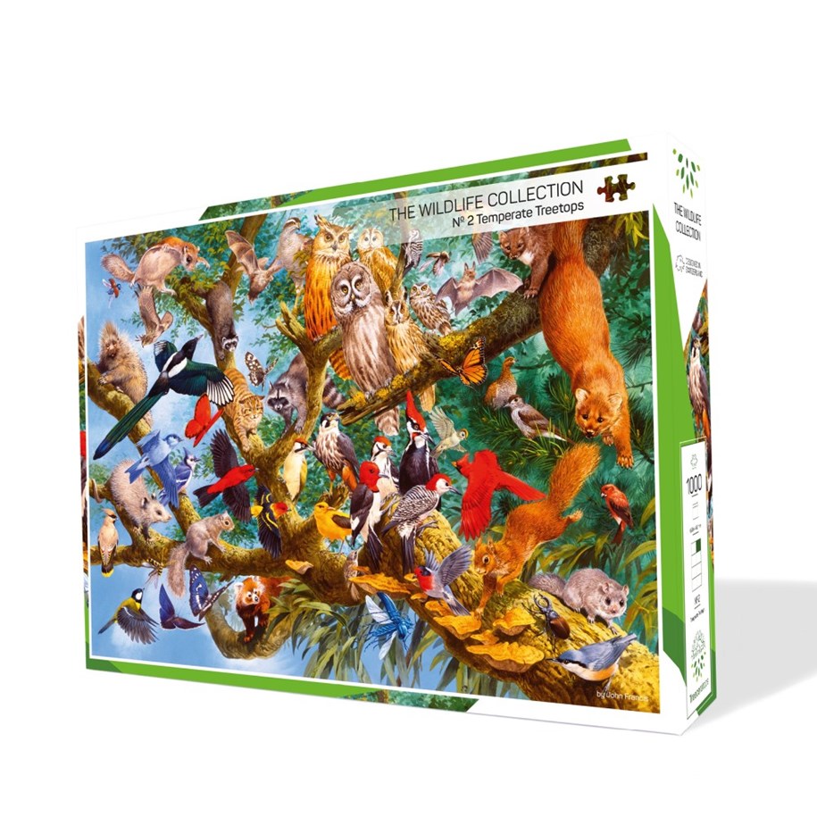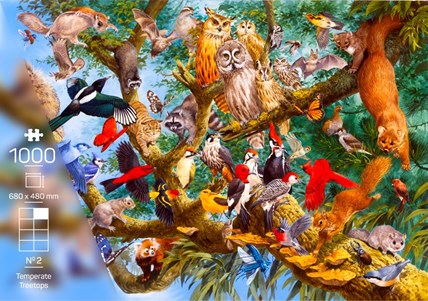 Temperate Treetops is de tweede puzzel in de Wildlife Collection en richt zich op de diverse, gespecialiseerde fauna die leeft in de boomtoppen van gematigde gemengde en naaldbossen. Dankzij de unieke tekentechniek lijken de dieren bijna fotorealistisch, waardoor de puzzel een indrukwekkend en natuurgetrouw beeld geeft.