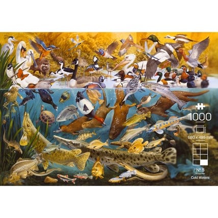 Cold Waters is de achtste puzzel in de Wildlife Collection en toont een levendig beeld van wat onze meren en beken zo bijzonder maakt – van majestueuze zwanen tot speelse otters. Dankzij een unieke tekentechniek lijken de dieren bijna fotorealistisch, wat zorgt voor een indrukwekkend en realistisch resultaat.
