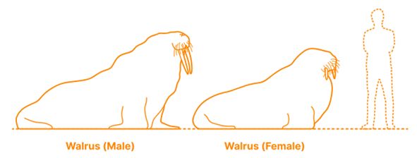 De kinderen tekenen zichzelf naast een walrus. Een mannetjes walrus komt tot boven de schouder van een volwassene (zie hieronder). Laat in de klas eerst zien hoe groot een walrus is. Wijs het aan bij jezelf, of plak bijvoorbeeld een post-it op de muur.
