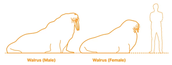 Je hebt vast wel eens een plaatje of filmpje van een walrus gezien: een grijs-bruin beest van wel 400 tot 1.800 kilo, met een dikke huid en twee slagtanden. Mannetjes en vrouwtjes hebben allebei slagtanden, maar die van de mannetjes zijn langer. En mannetjes zijn ook een stuk groter dan de vrouwtjes.