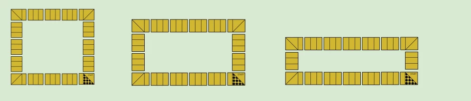 We beginnen met het bouwen van het bord. Hiervoor heb je 16 bordspelkaarten: 1 start-finish kaart, 3 hoekkaarten en 12 rechte kaarten. En het leuke, je mag zelf bepalen hoe je veld eruitziet. Zolang de hoeken en start/finish maar op de hoeken liggen, is het goed. Zo kun je dus elke keer op een compleet nieuw bord spelen. Bordspel bouw ze!