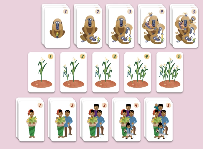 ● Verdeel de kaarten in 3 stapeltjes. 1x land, 1x bavianen en 1x mensen.