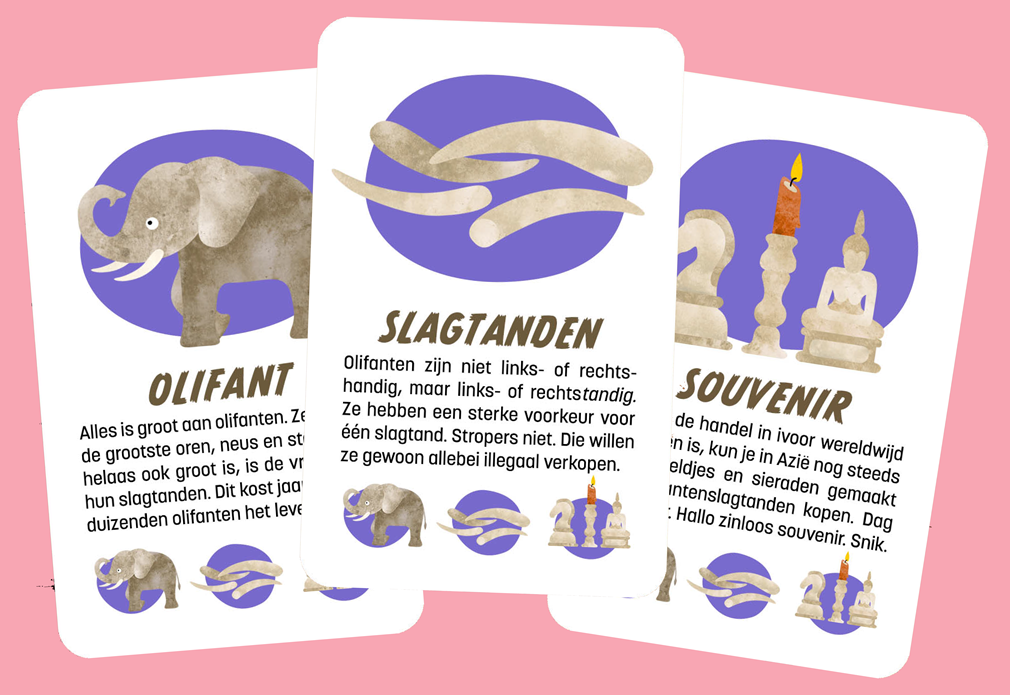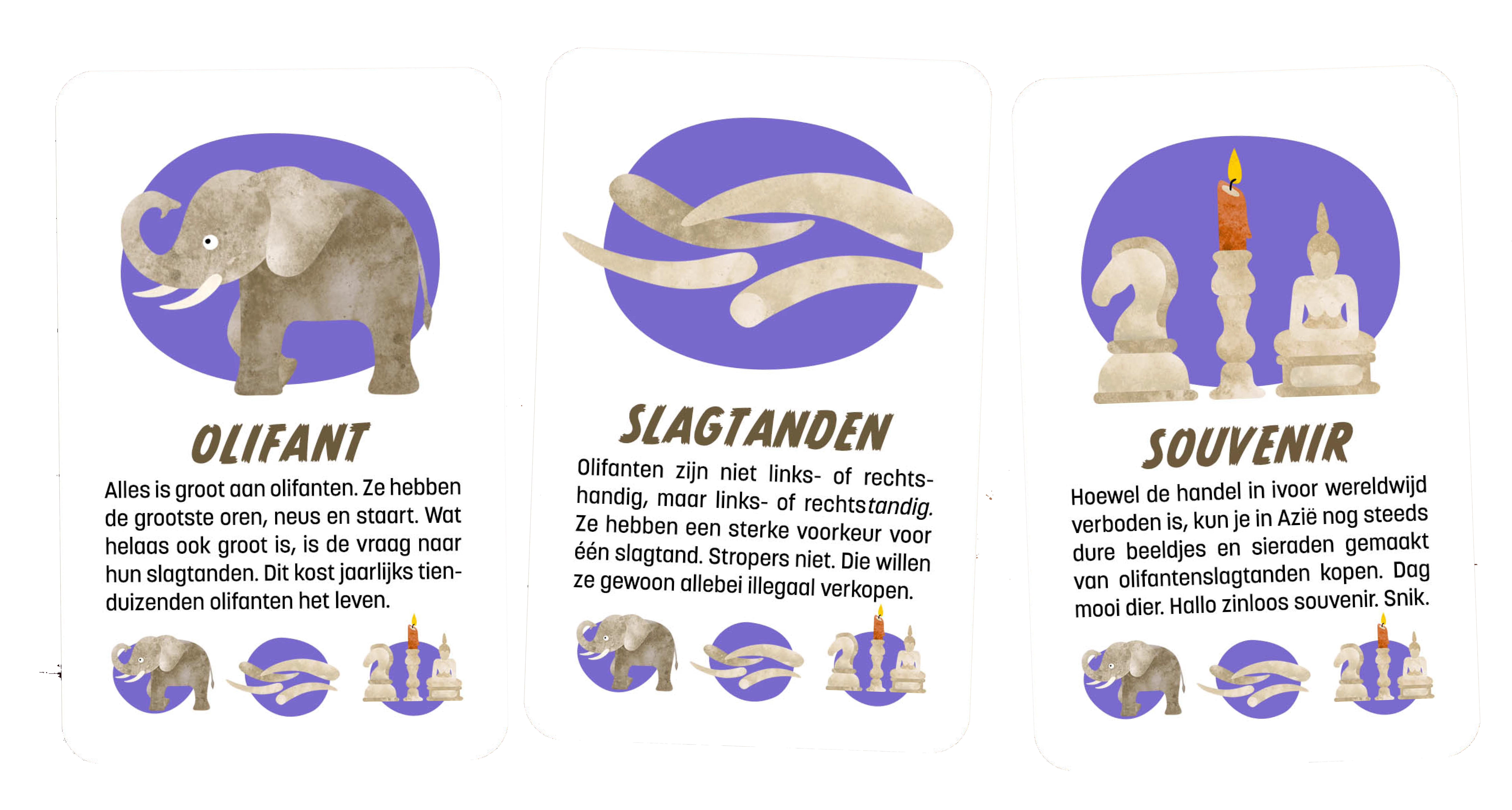 - Zoek eerste alle setjes van 3 kaarten bij elkaar. Dus het olifantensetje (olifant, slagtand, souvenir), het schubdiersetje (schubdier, schubben, medicijn), het haaiensetje (haai, vin, haaienvinnensoep), etc.