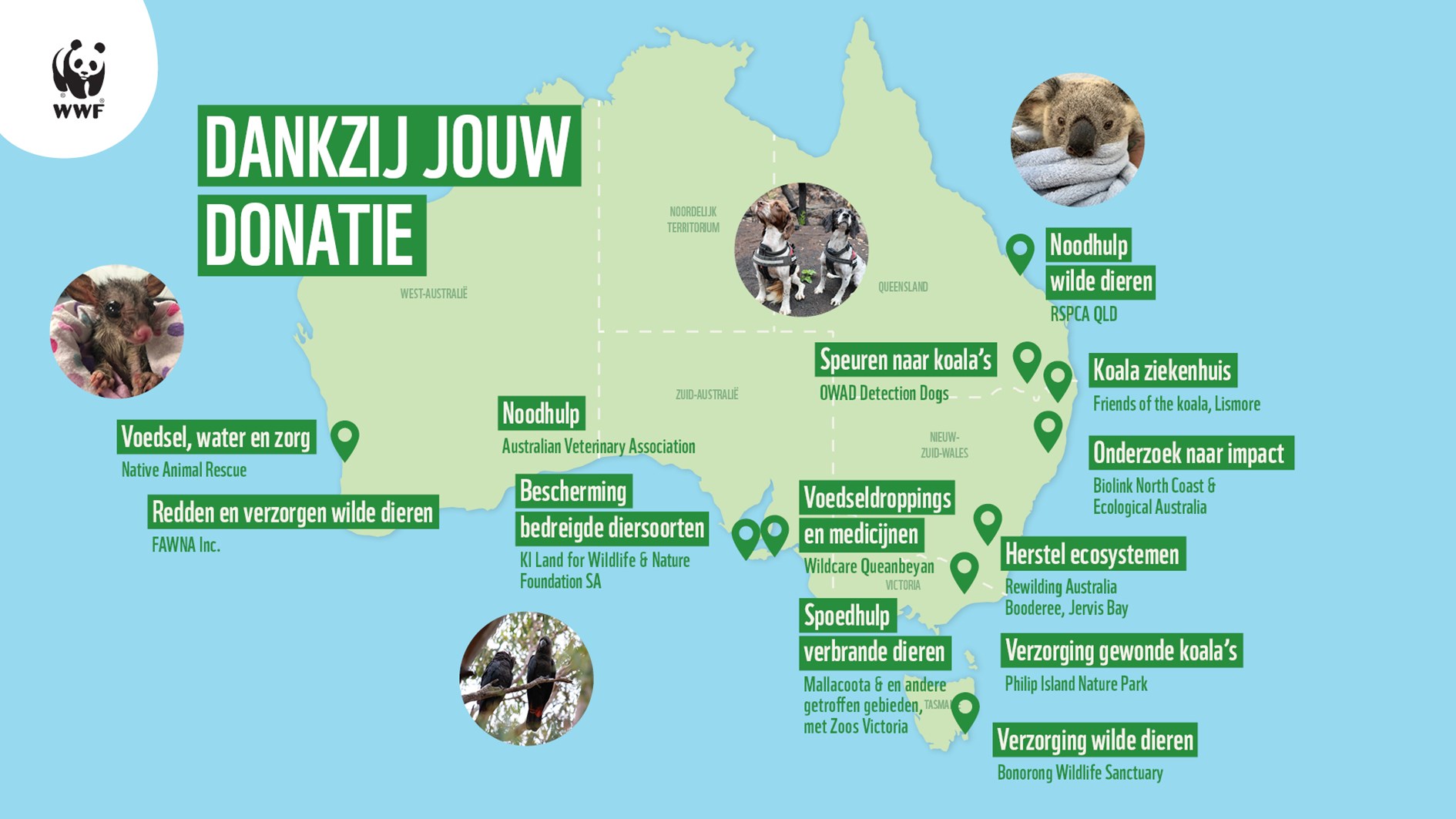 Heel Nederland kwam begin 2020 in actie voor Australië, en hoe! Met giften, activiteiten van vrijwilligers, speciale aankopen in de webshop, inzamelacties, Tikkies, SMS en de SOS Koala-jeugdactie haalde Nederland ruim 1,6 miljoen euro op voor WWF Australië. Ook nog eens 1.200 mensen werden donateur en duizenden hartverwarmende kaarten van kinderen voor de brandweermannen kwamen binnen. Ontzettend bedankt allemaal!