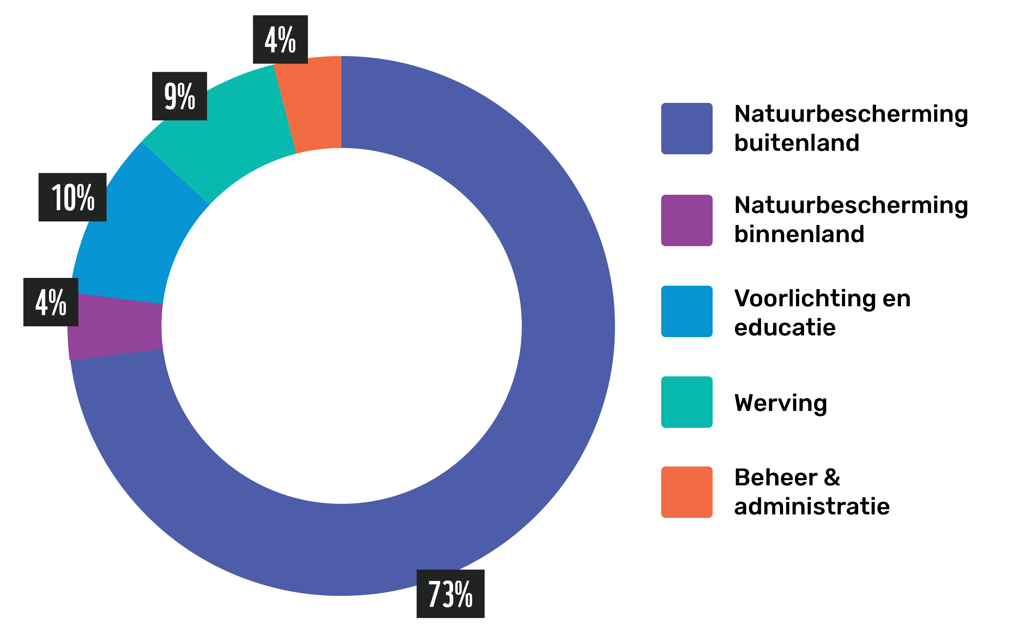 In het afgelopen boekjaar (lopend van juli 2023 tot en met juni 2024) gaf het Wereld Natuur Fonds 73% van de totale bestedingen uit aan natuurbescherming in het buitenland, 4% aan natuurbescherming in Nederland, 10% aan voorlichting en educatie, 9% aan wervingskosten en 4% aan beheer en administratie.