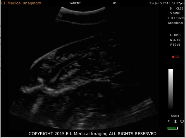 We willen weten of de haai zwanger is en in welk stadium van de zwangerschap ze verkeert. Op die manier kunnen we zien of ze op de Saba Bank pups krijgt, of dat ze de Saba Bank gebruikt voor voedsel tijdens de zwangerschap. Dit doen we door, net als bij mensen, een echografie te doen van de buik van de haai. Daar kun je op zien of de haai zwanger is of niet. Hieronder zie je de echo van een tijgerhaai.