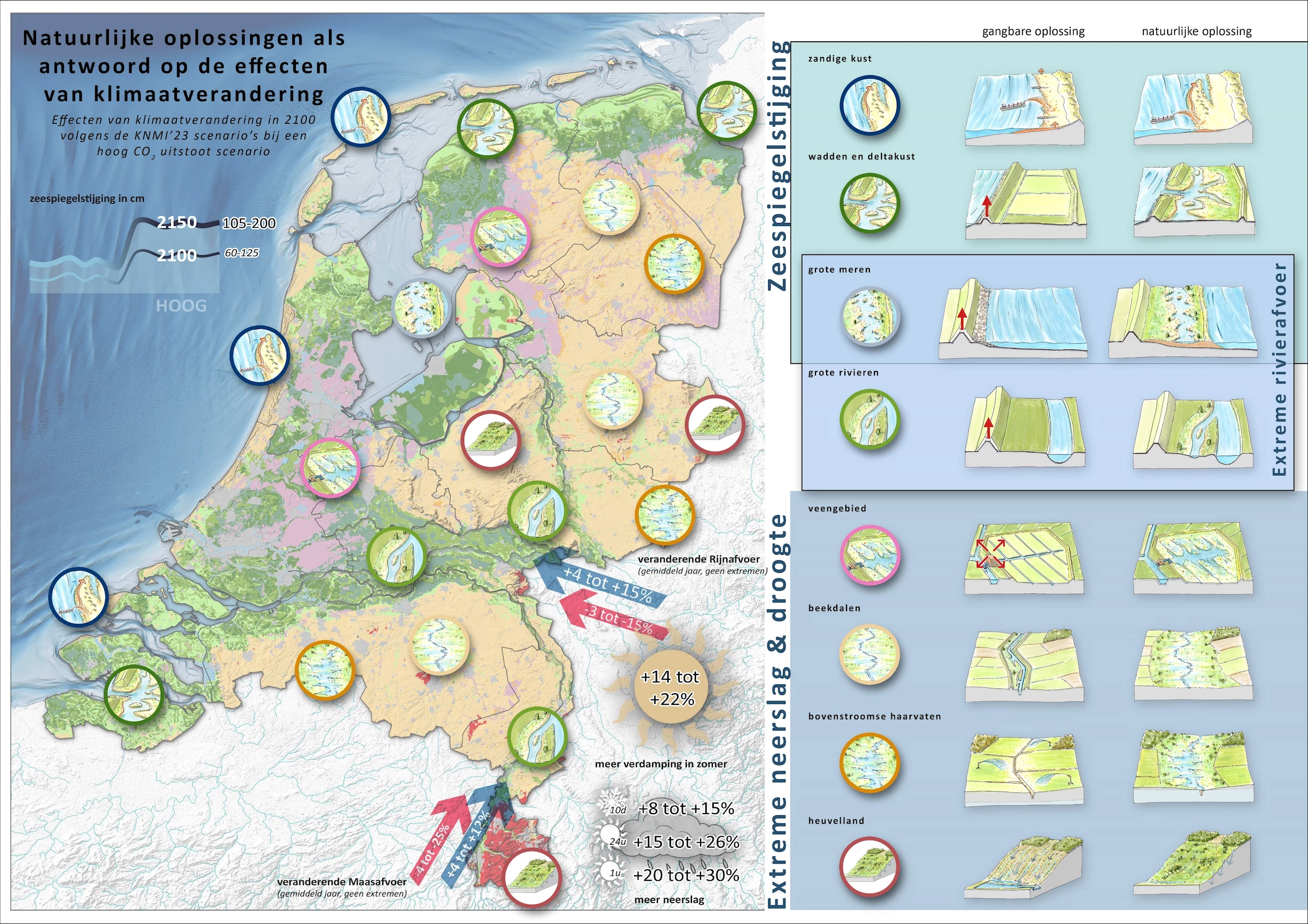 In heel Nederland kunnen we met natuurlijke oplossingen de gevolgen van klimaatverandering verminderen en dus tegelijk bouwen aan een mooier en natuurlijker Nederland. Denk aan meer duinen en kwelders in de kustregio om stormen op te vangen en ruimte voor de rivier om hoge rivierafvoeren op te vangen. In onderstaande infographic staan alle mogelijk natuurlijke oplossingen op een rij.