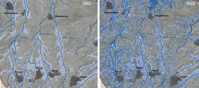 Nederland is in de vaart der volkeren voor 54% landbouwgebied geworden. En overal hebben we ons land super efficiënt vol gelegd met drainagebuizen, sloten, vaarten en gemalen. Kijk bijvoorbeeld naar de twee kaartbeelden hieronder. Deze zijn van het Noord-Brabantse landschap bij Hilvarenbeek waarop alle watergangen zijn aangeven in 1850 en ook 2020, een enorme toename is zichtbaar.