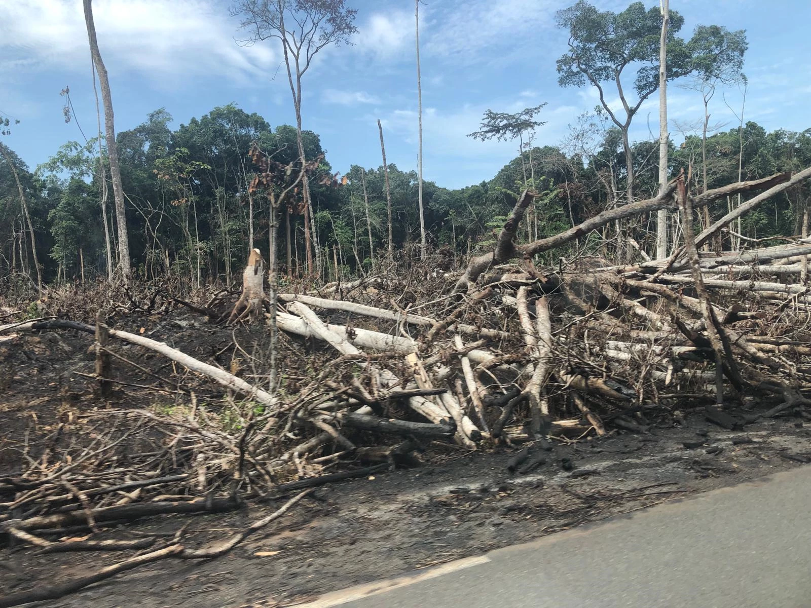 Ontbossing voor uitbreiding cacaoplantages langs de weg in Kameroen