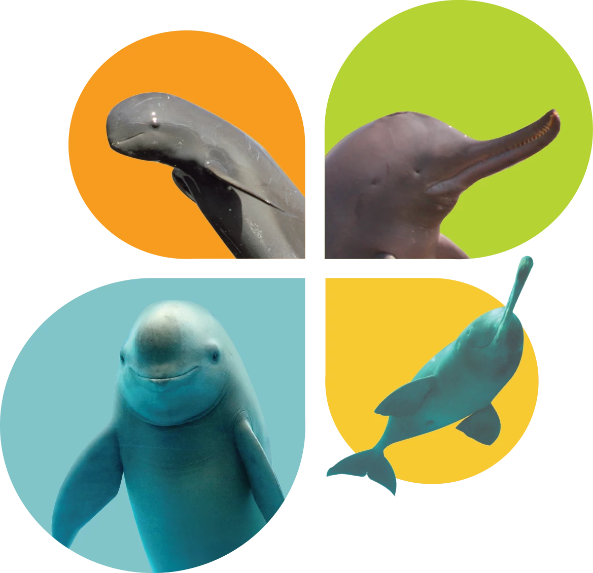 De Aziatische rivierdolfijnen, vanaf linksboven met de klok mee: Irrawaddy dolfijn, Indus rivierdolfijn, Ganges rivierdolfijn, Yangtze bruinvis