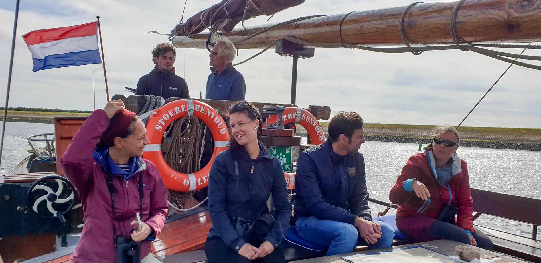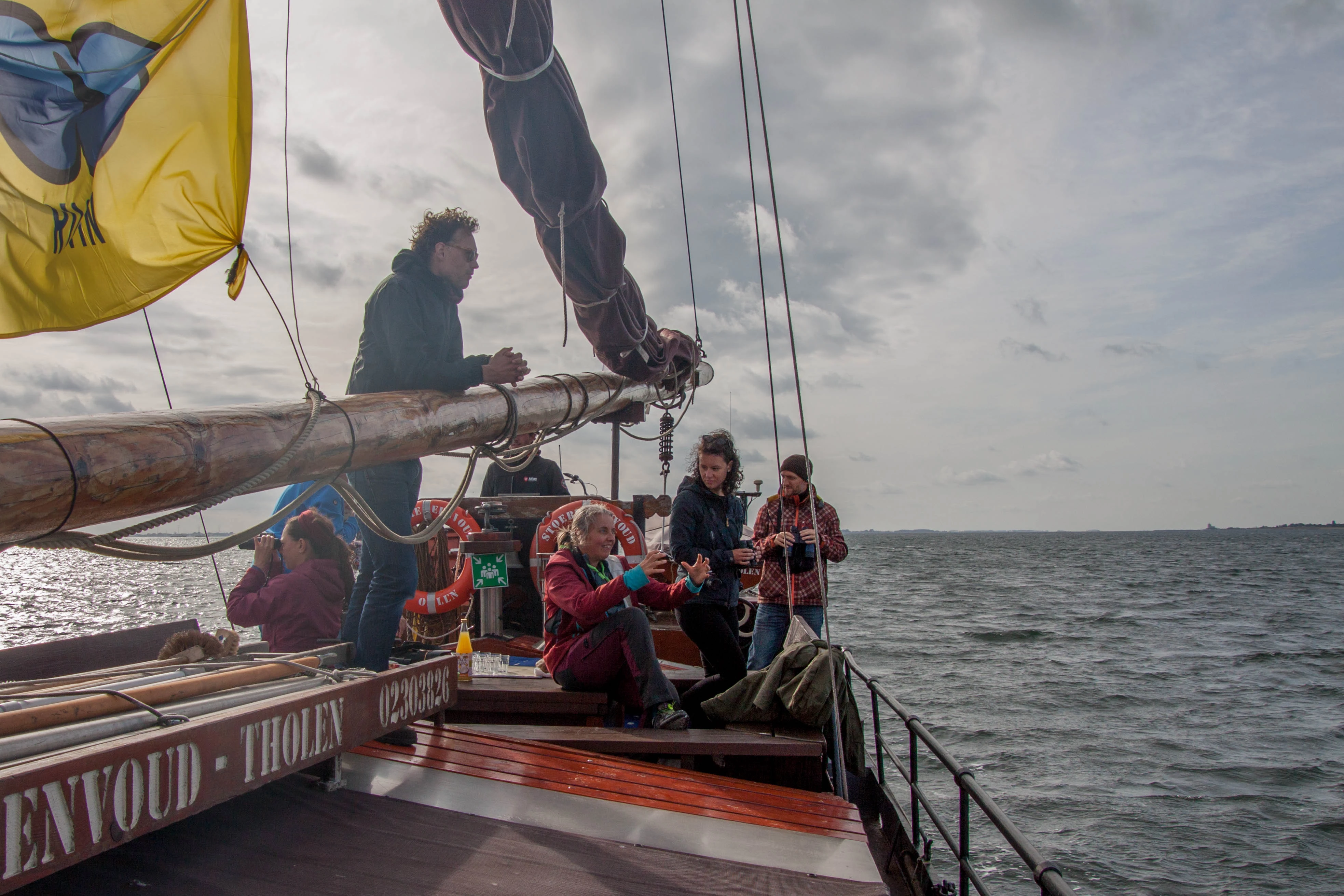 Na de lunch begint, wat mij betreft, het hoogtepunt van de excursie: bruinvissen zoeken. We varen van Bergse Diepsluis richting Gorishoek. Er staat een flinke wind en dat maakt het uitdagend om bruinvissen te vinden. Ik heb één voordeel: ik ben bekend met dit terrein. In mijn vrije tijd kom ik hier graag om vanaf de kust bruinvissen te spotten tijdens een wandeling. Toch zie ik nu het gebied met een andere blik zo vanaf het zeilschip. Bovendien weet je nooit wat je tegenkomt. Vorig jaar zijn er twee butskoppen en een lederschildpad gezien en momenteel zwemt er een tuimelaar rond.