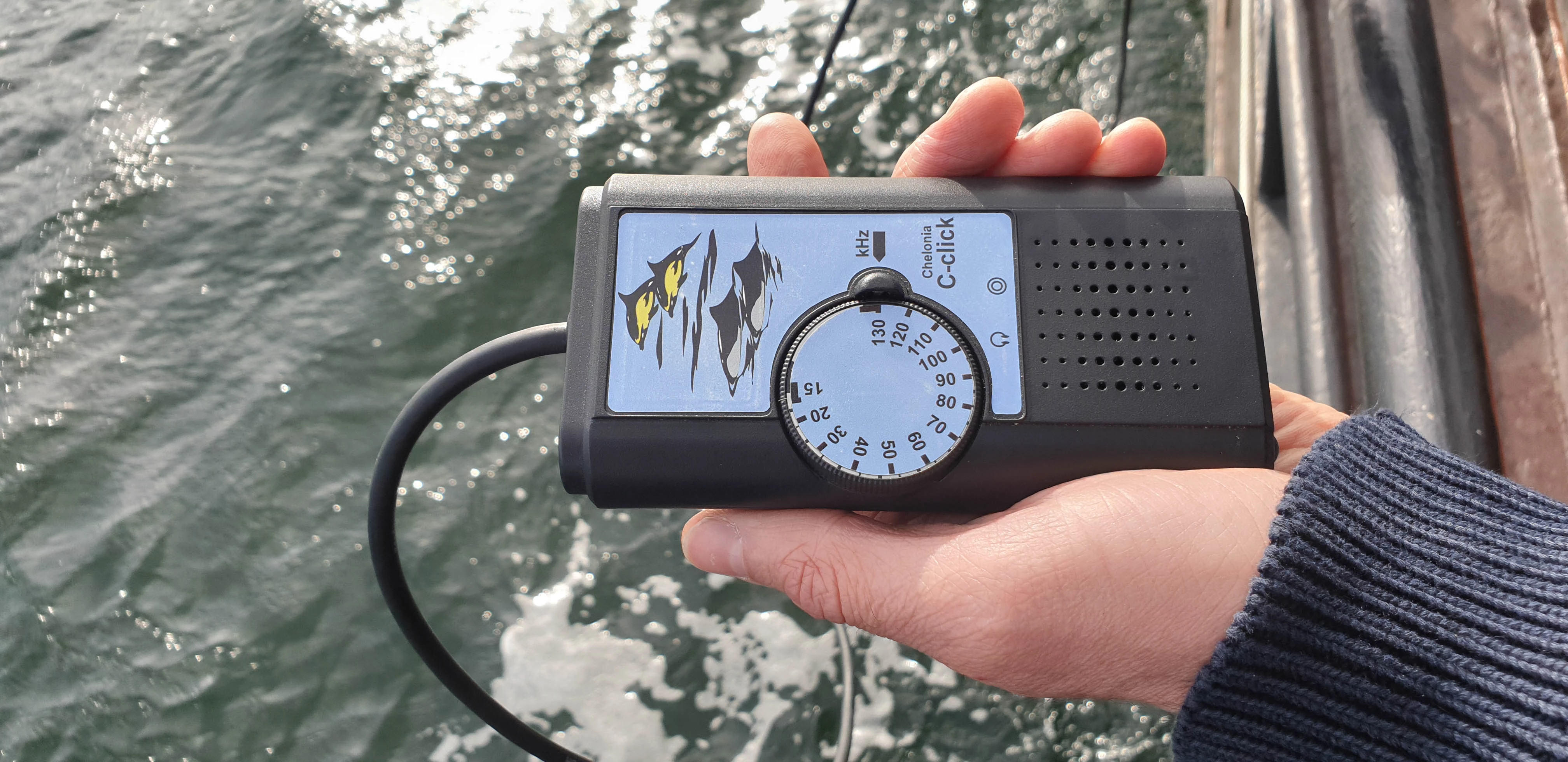 Op de heenweg valt er geen bruinvis te bekennen. Gelukkig is er een troef voor handen: bruinvissen vinden door te luisteren. Nadat we net voorbij Gorishoek voor anker zijn gegaan hangen we een speciale hydrofoon in het water. Dit apparaat is zo aangepast dat het de hoge frequenties van bruinvissen kan opvangen die normaal voor ons gehoor niet hoorbaar zijn. Bruinvissen gebruiken namelijk het geluid van kliks om hun weg en voedsel te vinden. Dit heet echolocatie. Met veel en hoge golven is het lastig om de rugvinnen van bruinvissen te zien en biedt onderwater luisteren een uitkomst. Helaas zijn er geen bruinvissen in de buurt, want we horen alleen het ruisen van het water. Wil je zelf naar bruinvissen luisteren? Dat kan! Bezoek Studio bruinvis bij het havenhoofd in Zierikzee. Als ze in de buurt van de gele boei met hydrofoon zijn, kan je ze horen. Voor mij klinkt het als het hameren op een spijker en een krakende deur.