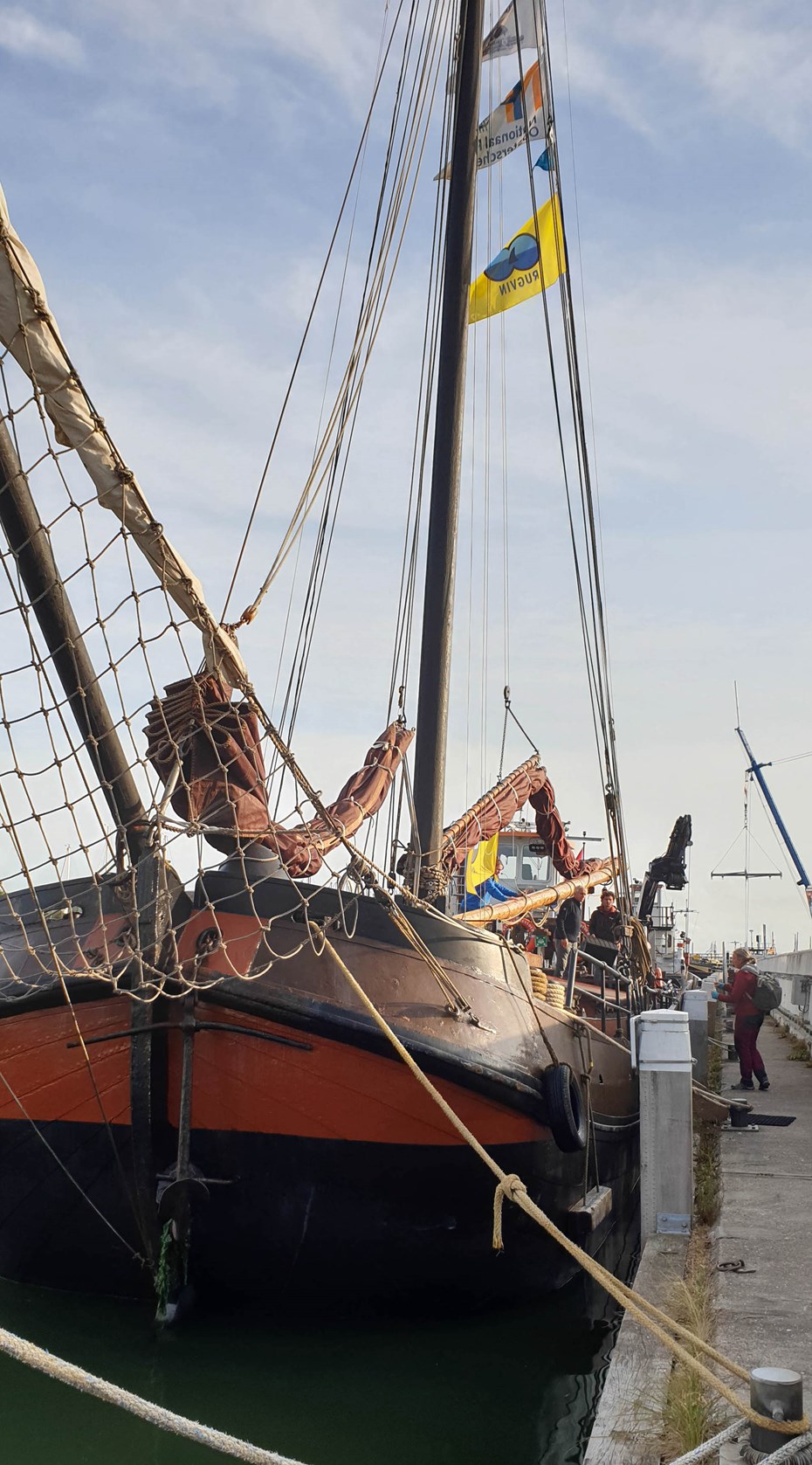 In de haven ligt het prachtige zeilschip de ‘Stoere Eenvoud’ te wachten. De gele vlag van Stichting Rugvin wappert uitnodigend in de wind. De tjalk zal mij en mijn mede-cursisten vandaag over de Oosterschelde dragen op zoek naar bruinvissen, de kleinste walvis van de Noordzee. Want om walvisachtigen te zien hoef je zeker niet naar het buitenland. De Oosterschelde is het thuis voor zo’n 50 à 60 bruinvissen en een uitstekende plek om deze kleine walvisachtigen te spotten.