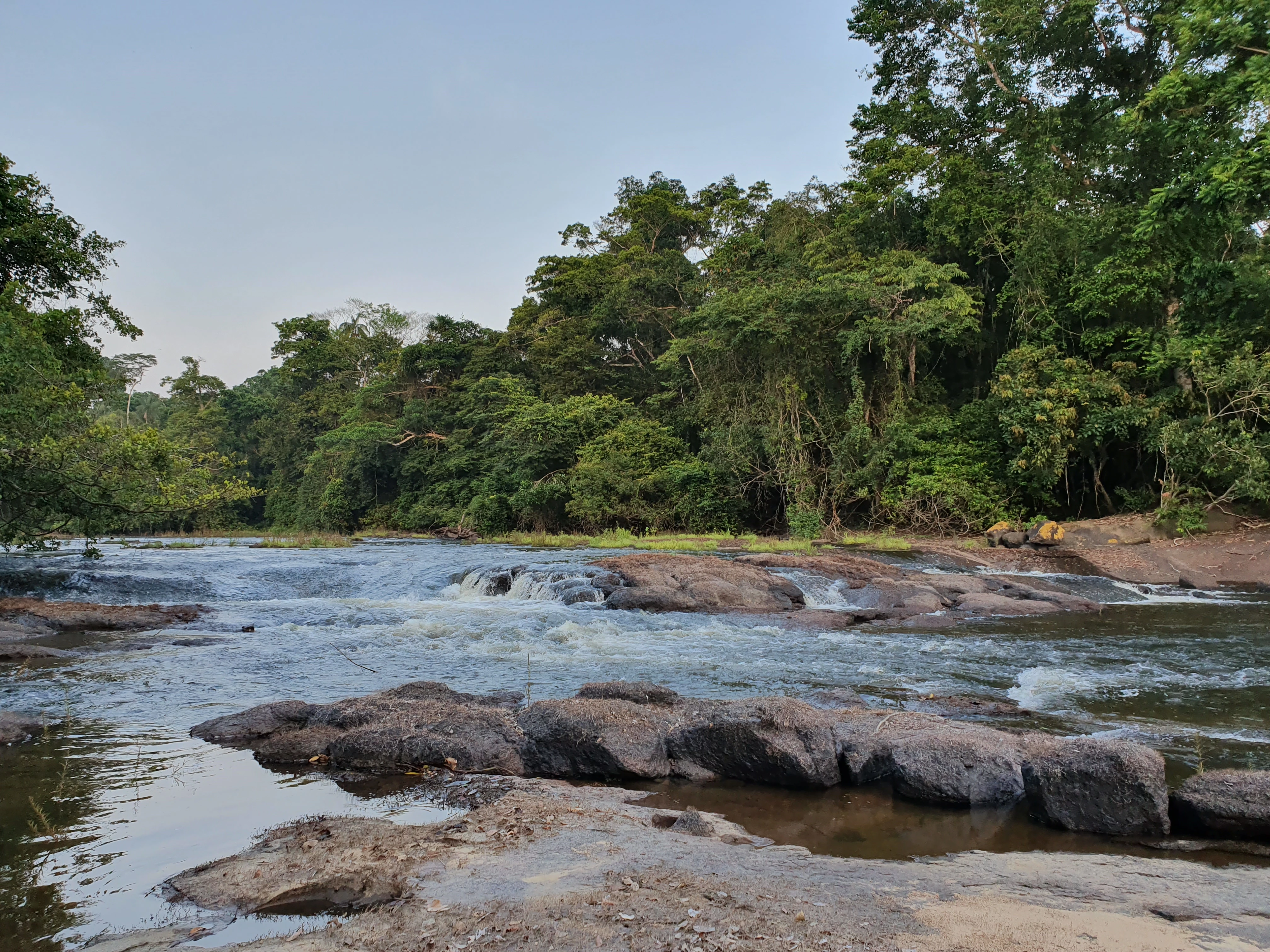De volgende ochtend om 5 uur, net voordat het licht wordt, lopen we met Djuup en Ivaneide naar de rivier naast het dorp: de levensader die hen voorziet van schoon drinkwater, vis en die ze gebruiken om per boot verder het gebied in te trekken om voedsel te verzamelen. We roeien in stilte naar een stroomversnelling om de zon op te zien komen. Een prachtig vredig moment.