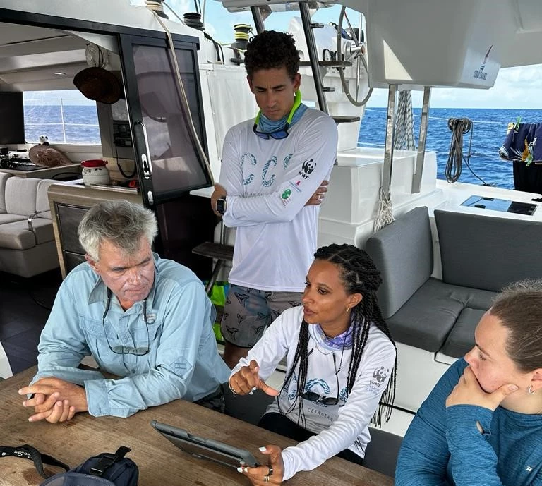 Wanneer we de dieren eenmaal hebben gevonden, wordt er snel bepaald welke diersoort het is en worden er met professionele telelens-camera’s (door voorzichtig te naderen zonder hun pad te kruisen en vanaf een veilige afstand van 300 meter) foto’s gemaakt van de rugvinnen van dolfijnen en staarten van walvissen. De analyse van deze foto’s bepaalt of we dezelfde individuen ook op andere plekken zijn tegengekomen en geeft informatie over hun bewegingspatronen. Dit is belangrijke informatie omdat dit laat zien waar de walvissen en dolfijnen heen gaan en met welke eilandgroepen er moet worden samengewerkt om ze te beschermen. Walvissen en dolfijnen kennen immers geen grenzen.