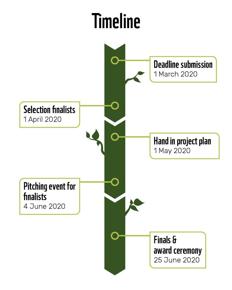 40 students submitted their inventive ideas to protect our nature. A jury selected three winners. They received €10.000 and professional coaching, which will hopefully help them to realise their project in the future. The winners are 'Green Healthcare', 'Picking up good Vibrations' en 'Reshore'.