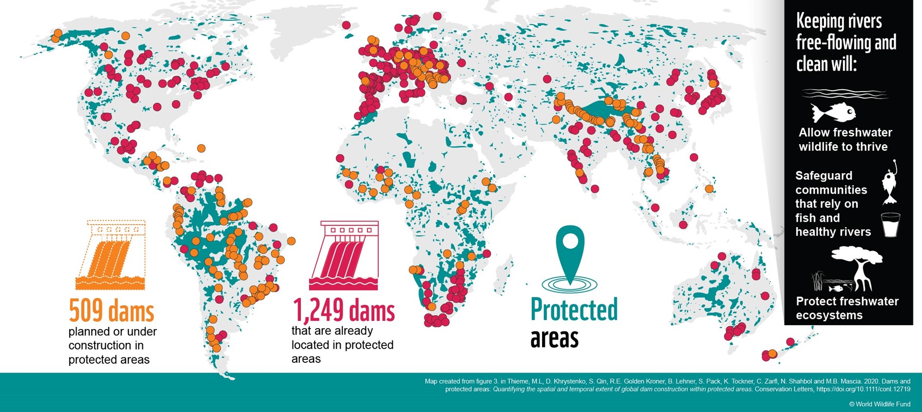 Het rapport ‘Dammen in beschermde gebieden’ beschrijft het allereerste wereldwijde onderzoek naar het aantal geplande en bestaande grote dammen binnen beschermde gebieden. Over de hele wereld staan 509 nieuwe grote obstakels in de planning, die komen bovenop de al bestaande 1.249 dammen in beschermde gebieden. En bijna 300 van de reeds bestaande dammen werden gebouwd na de oprichting van het beschermde gebied.