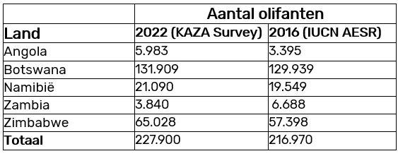 De meest recente data stammen uit 2016. De vandaag gepresenteerde resultaten zijn met deze data vergeleken. Gemiddeld genomen kan worden gesteld dat de populatie licht is toegenomen. Zo is het aantal olifanten in Angola gestegen en in Zambia gedaald. Maar daar staat tegenover dat de populaties in Zimbabwe, Botswana en Namibië licht zijn toegenomen.