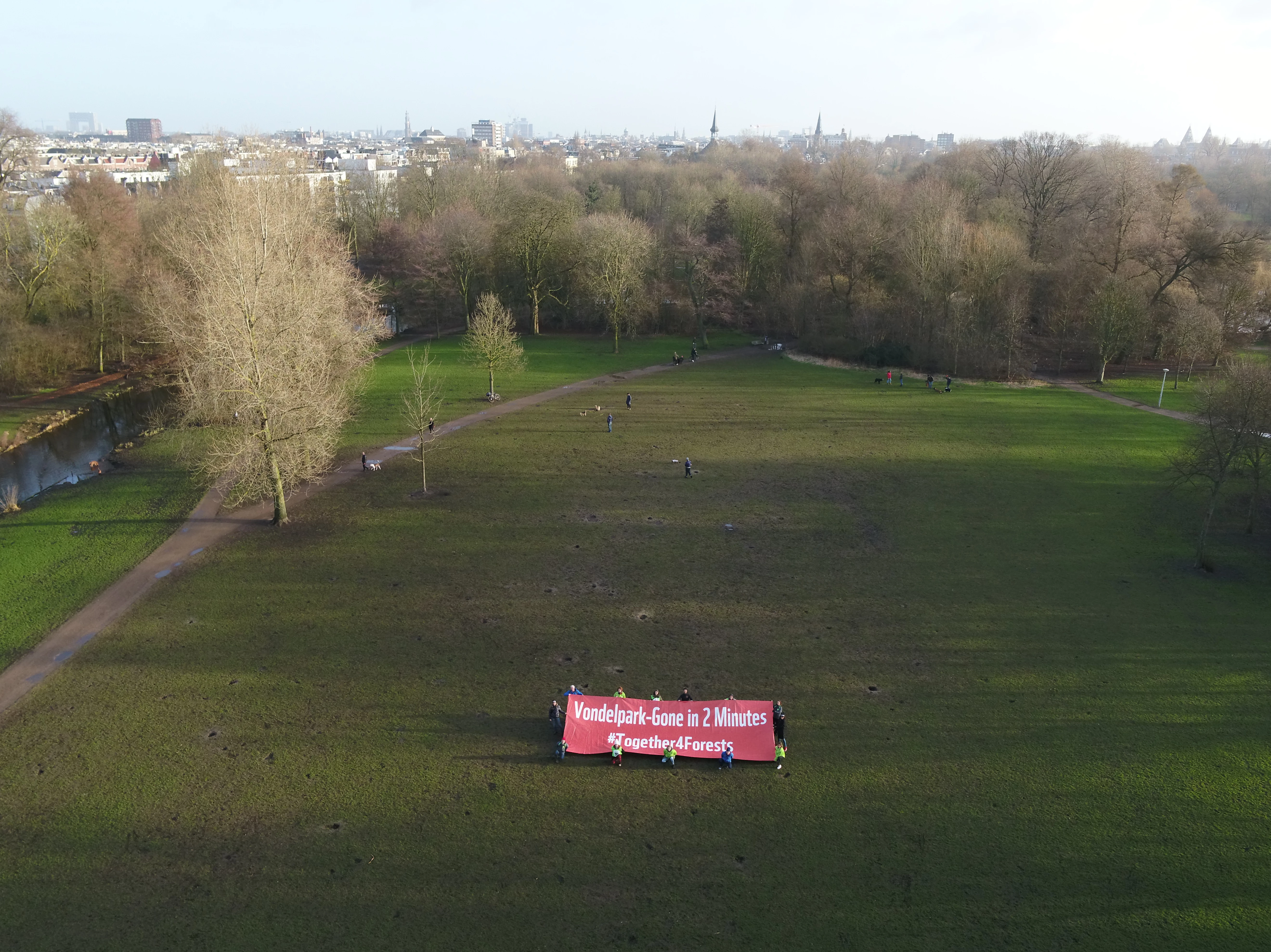 Samen met Greenpeace Nederland, World Animal Protection, Both ENDS, Milieudefensie en Vogelbescherming Nederland roepen we vandaag op tot actie. Iedereen in Europa kan een foto van een park insturen met de boodschap in hoeveel minuten dat park zou wegvagen. WWF-NL staat vandaag in het Vondelpark met een groot spandoek met de tekst: 'Vondelpark - Gone in 2 minutes. #Together4Forests'.