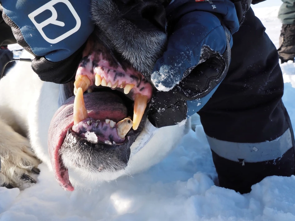 Het gebit van het oude mannetje, als je goed kijkt zie je dat de huid van een ijsbeer onder zijn witte vacht zwart is.