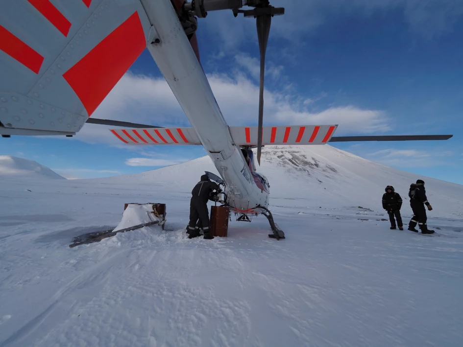 De helikopter die wordt gebruikt om ijsberen te zoeken wordt van brandstof voorzien