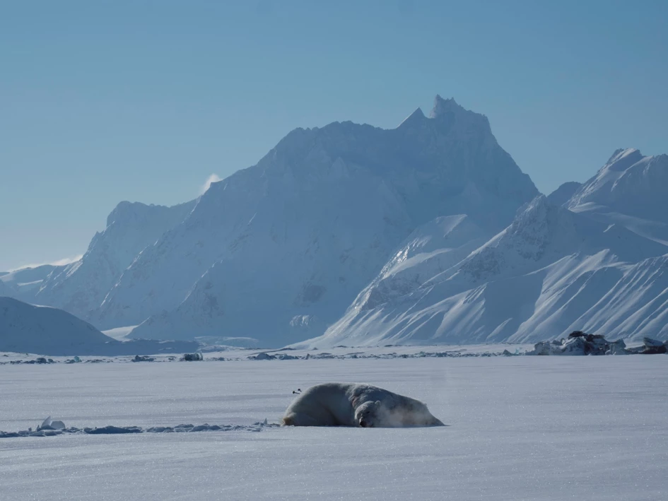 Een slapende ijsbeer met de berg Hornsund tind (1429 meters) op de achtergrond.