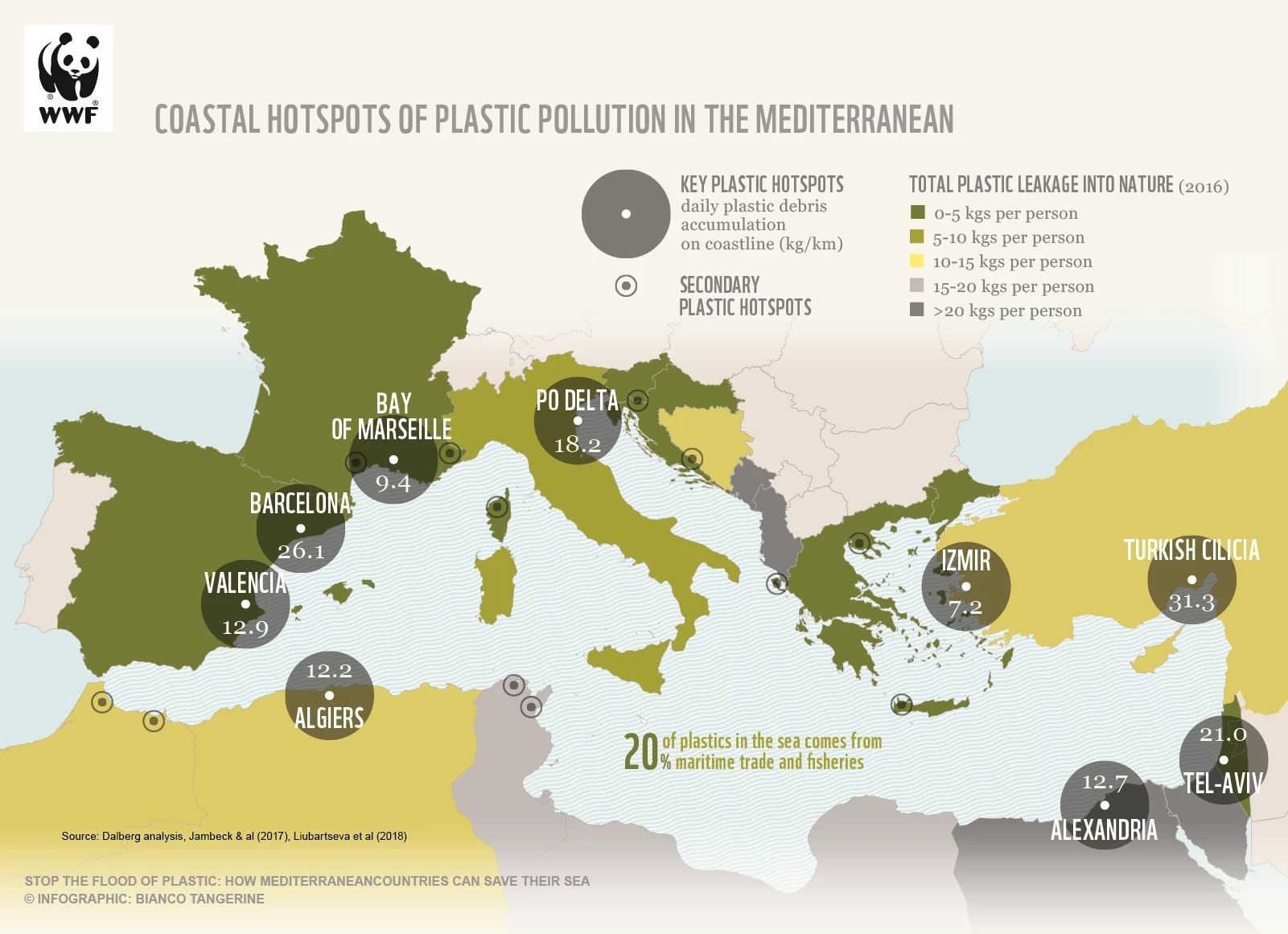 De concentratie microplastics in Middellandse Zee is één van de hoogste ter wereld, staat in het nieuwe WWF-rapport. Elke minuut verdwijnt een hoeveelheid plastic vergelijkbaar met 33.800 petflessen in zee. Massatoerisme speelt daarbij een grote rol. In de zomermaanden, als circa 200 miljoen toeristen de regio bezoeken, neemt de vervuiling in zee met 40 procent toe. Dat komt vooral door beperkte en slecht functionerende afvalverwerking.