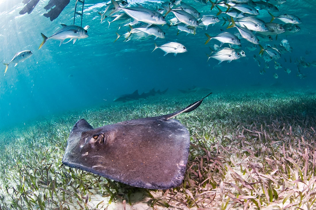 De grote bodembewoners zoals pijlstaart- en koeneusroggen zijn heuse ingenieurs. Met hun unieke manier van eten zoeken, bouwen ze mee aan holletjes en andere natuurlijke woonplaatsen voor kleinere ongewervelde dieren. Zwevend over zanderige zones, graven ze in het zand op zoek naar eten. Zo halen ze heerlijke snacks boven voor zichzelf en helpen ze ook andere zeedieren om voedsel te vinden. Van koraalvisjes op de bodem langs de paardmakrelen tot de zeevogels aan de oppervlakte zoals aalscholvers.