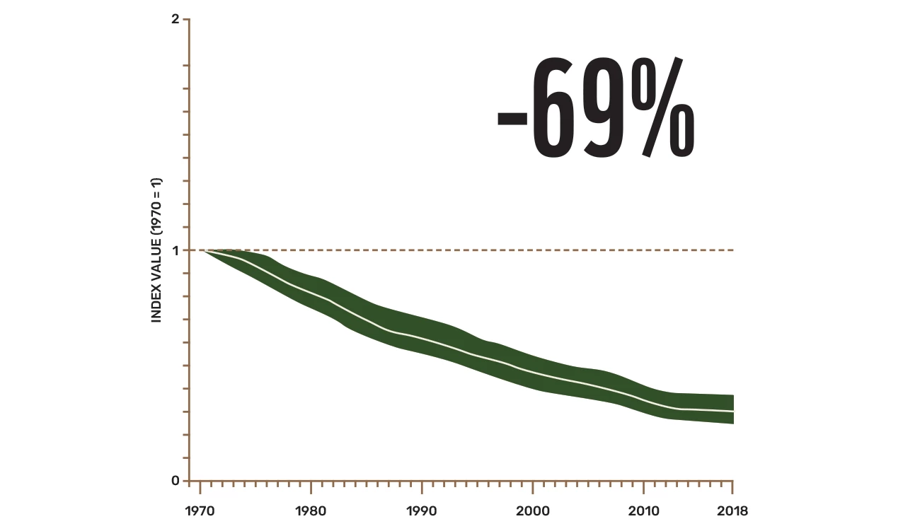 De populatiegrootte wilde dieren is gemiddeld met een schrikbarende 73 procent afgenomen ten opzichte van 1970.