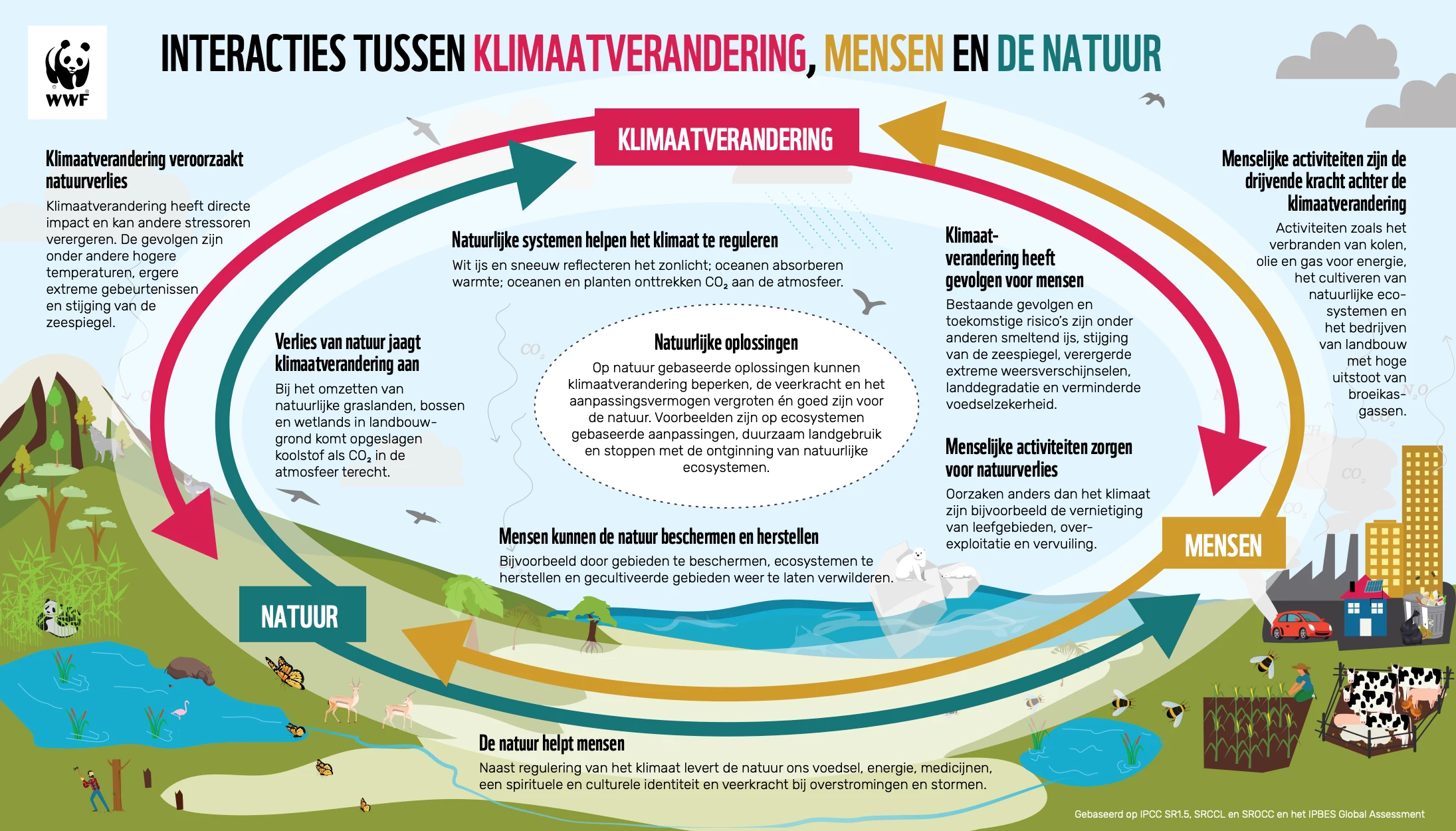 Meer natuur zorgt voor meer CO2-opname en dus afkoeling, meer veiligheid, meer biodiversiteit en voldoende voedsel en water voor iedereen. Als we meer bomen planten en rivieren de ruimte geven, kunnen we het water beter vasthouden. Met meer mangroves en meer koraalriffen, natuurlijke buffers, kunnen we kwetsbare kustgebieden beter beschermen.