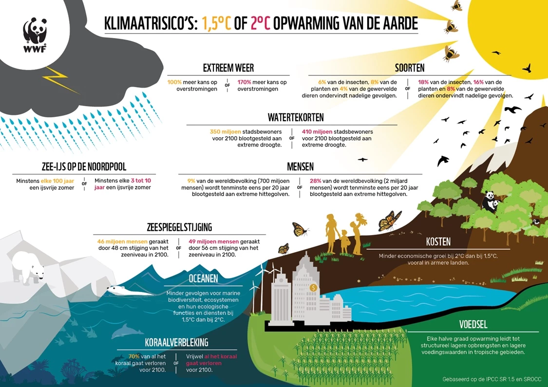Dit heeft effect op mensen, dieren en planten. Veel bedreigde dier- en plantsoorten leven in gebieden die lijden onder de effecten van klimaatverandering. Het klimaat verandert zo snel dat dieren en planten zich niet snel genoeg kunnen aanpassen. Als we niks doen tegen klimaatverandering sterft een derde van alle dier- en plantsoorten mogelijk nog binnen een eeuw uit. Daarbij maakt het veel uit hoeveel de temperatuur stijgt. In de infographic hieronder zie je het verschil tussen 1,5°C en 2°C temperatuurstijging.