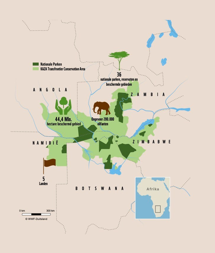 In een gebied dat zich uitstrekt over delen van Angola, Botswana, Namibië, Zambia en Zimbabwe ontstaat momenteel een enorm grensoverschrijdend park, de Kavango Zambezi Transfrontier Conservation Area (KAZA). Wilde dieren houden zich immers niet aan landsgrenzen en daarom gaat KAZA daar overheen. Het park is zo groot dat er altijd genoeg te eten is voor wilde dieren. Het punt is: ze moeten wel naar het voedsel toe kunnen. Daarom komen er zes routes die dieren kunnen volgen om van de ene kant van KAZA naar de andere te trekken. Zonder in conflict te raken met mensen. Sterker nog: als alles goed gaat, kan de bevolking straks op een extra inkomstenbron rekenen: toerisme.