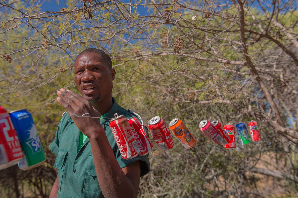 Hierboven: Humphrey Mwanga, een ranger in Wuparo Conservancy, Namibië, legt uit hoe blikjes olifanten op afstand houden © Gareth Bentley / WWF