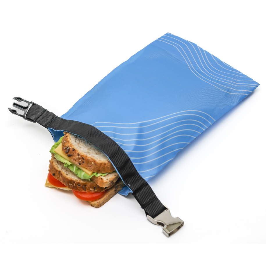 De ruime lunchzak heeft een dubbele voering en stevige kliksluiting, waardoor je eten vers en luchtdicht blijft. Het verstelbare formaat biedt ruimte voor zowel een kleine snack als een uitgebreide lunch. Na gebruik vouw je hem eenvoudig op tot een compact pakketje. De gladgestreken voering maakt schoonmaken snel en hygiënisch. Geschikt voor boterhammen, fruit, snacks of om etenswaren in te vriezen. De frisse oceaankleuren geven de zak een moderne, stijlvolle uitstraling.