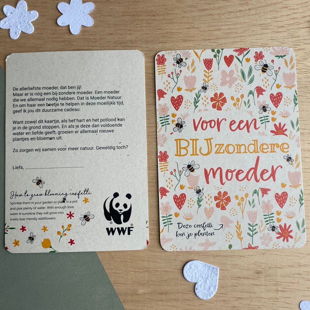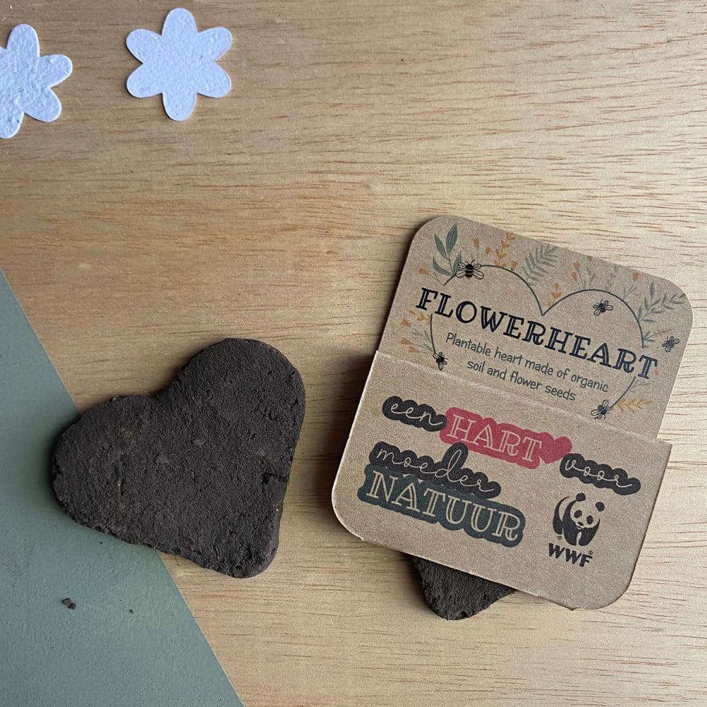 Het hart is gemaakt van biologische klei en bevat 100% biologische zaden. Als jouw moeder het hart in de tuin of in een potje plant en het genoeg water en vooral genoeg liefde geeft, groeien er later dit jaar mooie wilde veldbloemen uit. En zo zorgen jullie samen voor meer natuur!