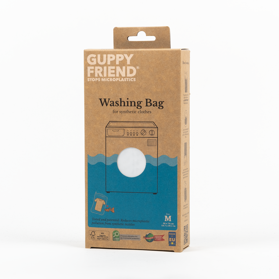 De Guppyfriend-waszak is een gepatenteerde oplossing die de kleinste microvezels filtert die vrijkomen bij het wassen van textiel. De zelfreinigende stoffen tas is gemaakt van een speciaal ontworpen microfilter-materiaal. Verzamel na het wassen eenvoudig de vezels en voer ze op de juiste manier af. Stop synthetische kleding in de waszak, vul tot ongeveer de helft en sluit hem. Draai het wasprogramma samen met de overige was en de Guppyfriend. Haal de gewassen kleding uit de waszak en verwijder vervolgens de micro deeltjes en gooi ze bij het restafval of bewaar de deeltjes in een potje, dan kun je zien hoeveel microplastics er minder in het water zijn gekomen.