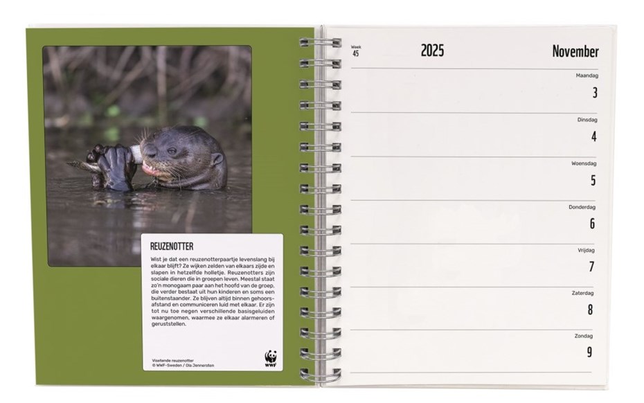 Ook in 2026 kan je gebruik maken van de klassieke, papieren WWF-agenda. Handig om al je afspraken in te noteren en tegelijkertijd kunt genieten van de mooiste dierenfoto's.