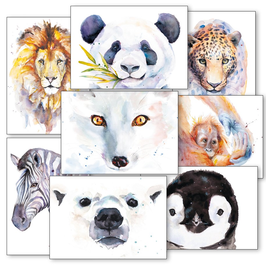 Set van 8 ansichtkaarten - Aquarel tekeningen dieren