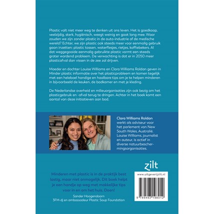 Moeder en dochter Louise Williams en Clara Williams-Roldan geven in Minder plastic informatie over het plasticprobleem en komen tegelijk met een heleboel handige en haalbare tips om je te helpen minderen in bijvoorbeeld de keuken, de badkamer en met je kleding.