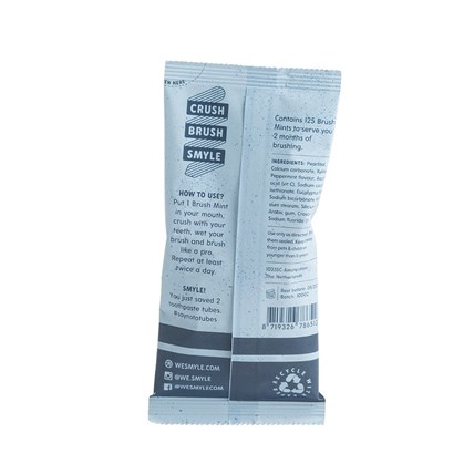 Zeg vaarwel tegen tandpastatubes en stap over op Smyle Brush Mints: tandpasta in handige tabletvorm. Deze Starter-Kit Small bevat 125 Brush Mints en een bewaarflesje – genoeg voor 2 maanden poetsen voor één persoon (twee keer per dag), 1 maand voor twee personen of een halve maand voor vier personen. De tabletten werken net zo goed als gewone tandpasta en zijn gemaakt van uitsluitend natuurlijke ingrediënten, vrij van ‘harsh chemicals’, microplastics, allergenen en gluten. Bovendien zijn ze vegan en dierproefvrij.