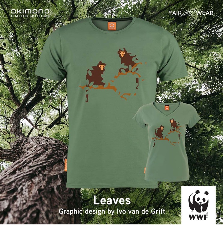 Het zevende shirt in de serie Okimono x WWF t-shirts draagt de naam Leaves. Het ontwerp, gemaakt door Ivo van de Grift, is een ode aan een stel apenkoppen, het leven op grote hoogte en de kunst van het weglaten.
