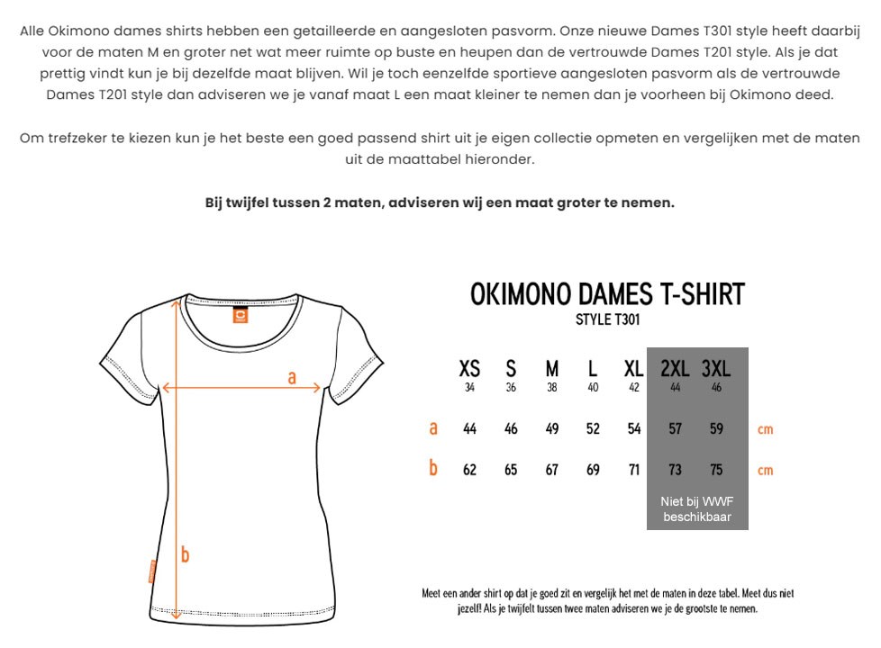 Het t-shirt is verkrijgbaar in een herenuitvoering met ronde hals en een damesuitvoering met V-hals. Op de website van Okimono zijn daarnaast ook andere uitvoeringen beschikbaar, waaronder kindermaten.