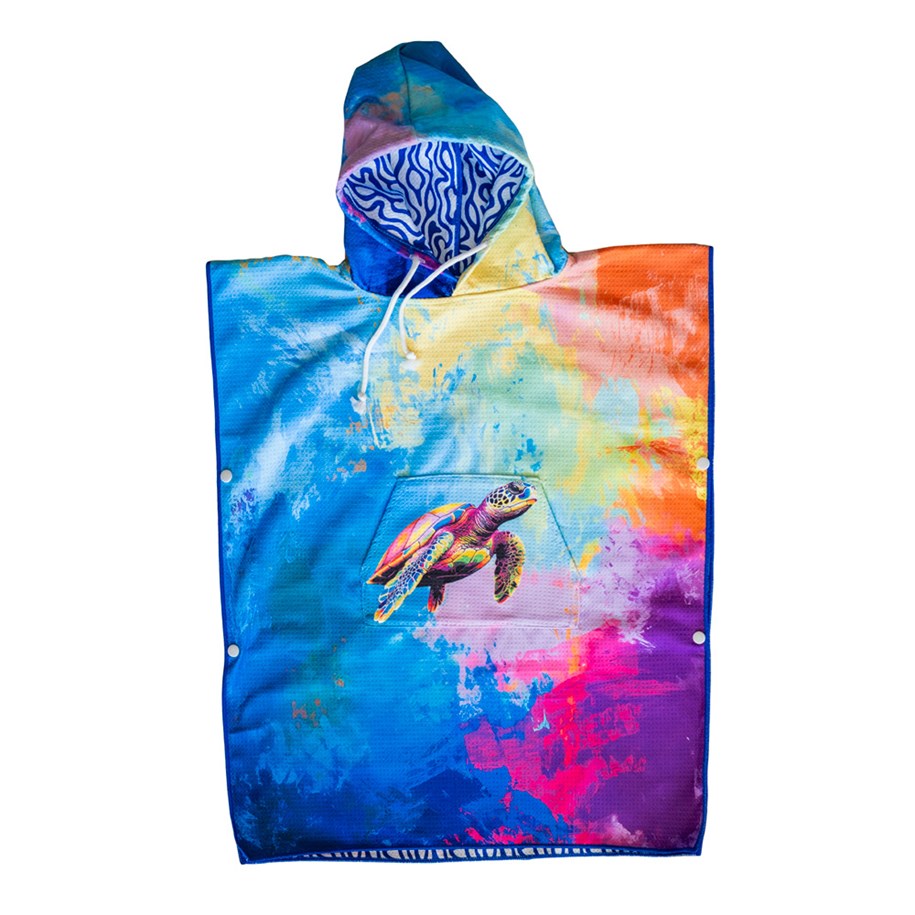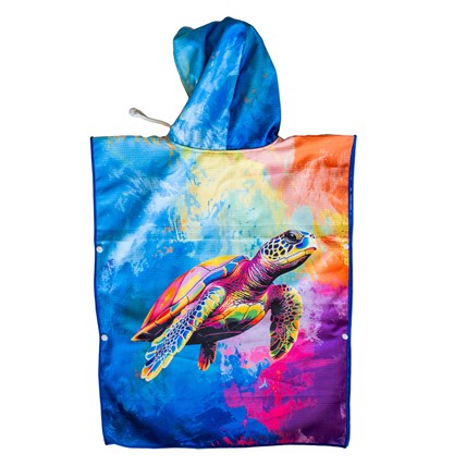 Deze coole surfponcho is perfect om na het zwemmen snel weer warm te worden. Gemaakt van lichtgewicht, sneldrogend materiaal waar geen zand aan blijft plakken, is hij zowel comfortabel als praktisch. De poncho heeft een ruime buidelzak aan de voorkant en een capuchon om nat haar te beschermen. Hij wordt geleverd met een handig bijpassend rugzakje van hetzelfde materiaal en is compact genoeg om mee te nemen in elke tas, rugzak of koffer. Dankzij de drukknopen kan de poncho ook worden uitgeklapt en gebruikt als strandlaken.