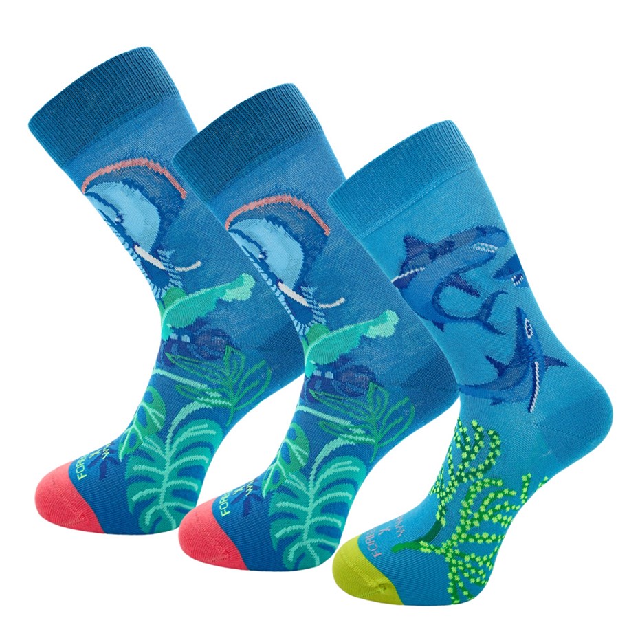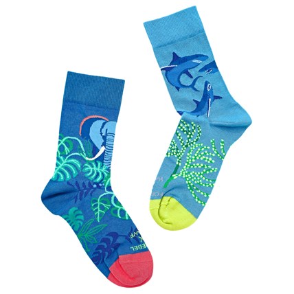 De sokken komen in vrolijke kleuren zoals groen en blauw, elk versierd met opvallende prints. Zoals deze met een stoere olifant en een vervaarlijke haai.