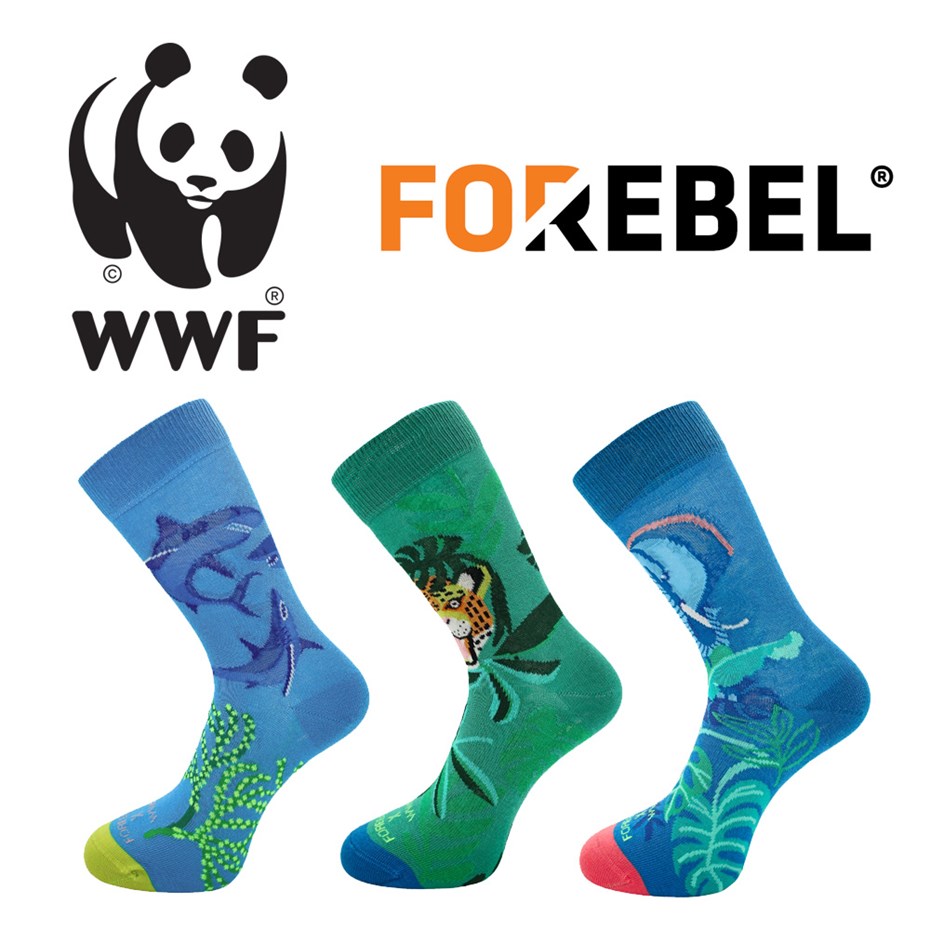 Het bedrijf Forebel brengt sokken uit onder verschillende labels. Naast het label Healthy Seas Socks maken zij ook sokken onder het eigen label Forebel. Ook deze sokken zijn zo duurzaam mogelijk gemaakt en daarom passen ze zo goed bij WWF. In de WWF x Forebel collectie vind je unieke sokken met dieren zoals de haai, de jaguar en de olifant.