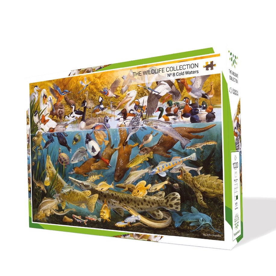 Cold Waters is de achtste puzzel in de Wildlife Collection en toont een levendig beeld van wat onze meren en beken zo bijzonder maakt – van majestueuze zwanen tot speelse otters. Dankzij een unieke tekentechniek lijken de dieren bijna fotorealistisch, wat zorgt voor een indrukwekkend en realistisch resultaat.